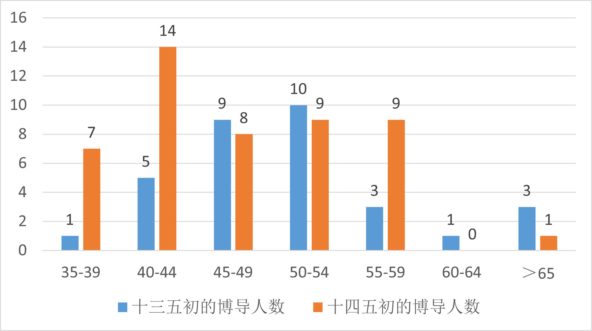 圖2 “十三五”和“十四五”初期的博士生導(dǎo)師年齡結(jié)構(gòu)分布