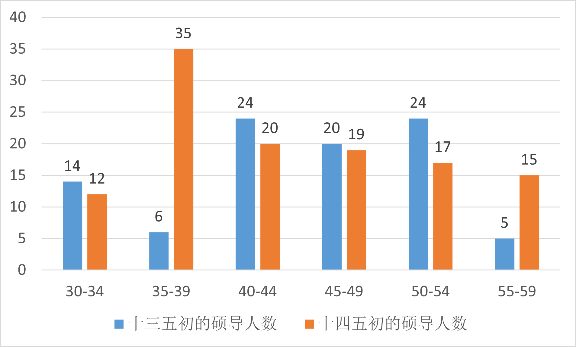 圖3 “十三五”和“十四五”初期的碩士生導(dǎo)師年齡結(jié)構(gòu)分布