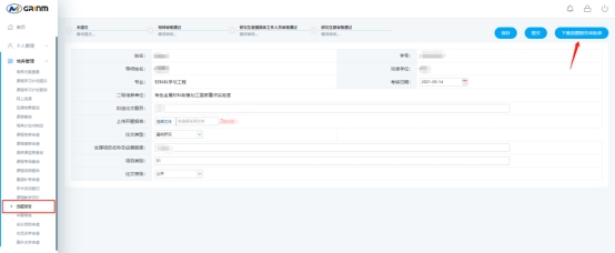 (2)研究生應(yīng)在答辯前,登錄研究生管理信息系統(tǒng),在“培養(yǎng)管理”→“選題報(bào)告”中下載空白《選題報(bào)告審核表》,并根據(jù)實(shí)際情況填寫(xiě)相應(yīng)內(nèi)容。其余內(nèi)容在答辯前不做修改及填寫(xiě)。
