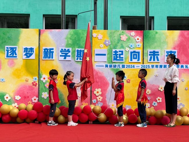 9月2日上午,有研幼兒園全體師幼聚集在操場(chǎng),帶著希望,帶著憧憬,舉行了新學(xué)期的開學(xué)典禮。大班升旗手高舉著五星紅旗入場(chǎng),在莊嚴(yán)的國(guó)歌聲中,五星紅旗冉冉升起。