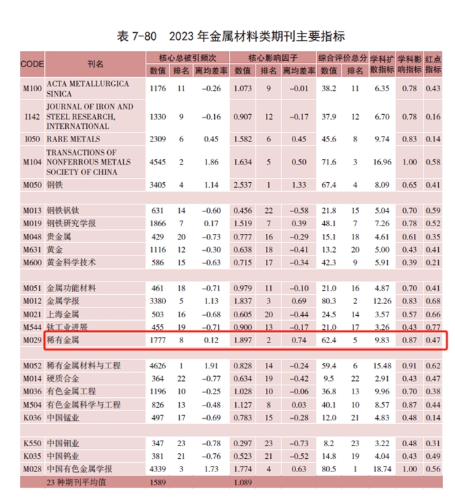 9月20日,由中國科學(xué)技術(shù)信息研究所主辦的“2024年中國科技論文統(tǒng)計(jì)結(jié)果發(fā)布會暨中國一流科技論文世界影響力評價論壇”在北京召開。根據(jù)會議發(fā)布的《中國科技期刊引證報告》,《稀有金屬》2023年度核心影響因子(CJCR)為1.897,較2022年度(1.751)提升8%,位列金屬材料學(xué)科第二(2/23)。