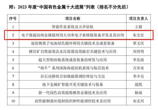 12月13日,中國有色金屬學(xué)會揭曉2023年度“中國有色金屬十大進(jìn)展”獲獎名單,中國有研所屬有研工研院“電子級超高純金屬提純用大功率電子束熔煉裝備開發(fā)及其應(yīng)用”項目成功入選。