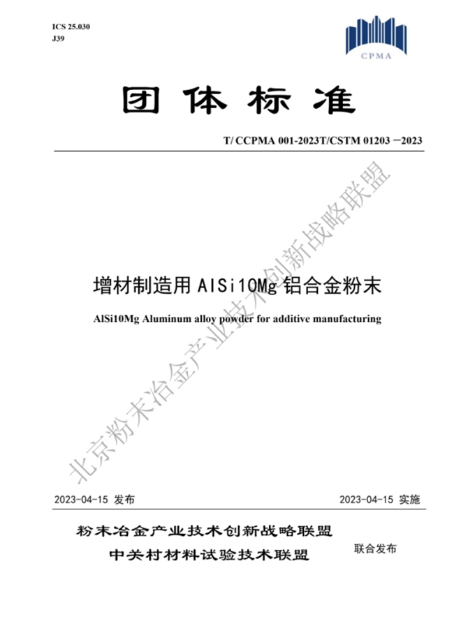 近日,由有研增材技術(shù)有限公司牽頭、聯(lián)合增材制造產(chǎn)業(yè)鏈上下游其他五家單位共同制定的團(tuán)體標(biāo)準(zhǔn)《增材制造用AlSi10Mg鋁合金粉末》(標(biāo)準(zhǔn)號(hào):T/ CCPMA 001-2023T/CSTM 01203—2023)榮獲2024年度中關(guān)村材料試驗(yàn)技術(shù)聯(lián)盟標(biāo)準(zhǔn)創(chuàng)新貢獻(xiàn)獎(jiǎng)一等獎(jiǎng)。