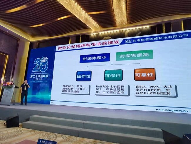 10月15日,中國電子材料行業(yè)協(xié)會電子錫焊料材料分會第二十八屆年會在海南省三亞市召開,北京康普錫威科技有限公司作為電子錫焊料材料分會副理事長單位受邀參加,總經(jīng)理王志剛以《錫基電子焊料產(chǎn)業(yè)現(xiàn)狀和技術(shù)發(fā)展》為題在大會上作報告。