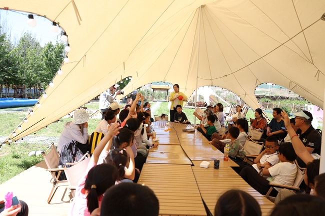 在基地的露營野餐環(huán)節(jié),家長和孩子們圍坐一起分享美食,交流著上午游玩的趣事,氛圍溫馨而融洽。午餐過后的擊鼓傳花互動(dòng)環(huán)節(jié)將活動(dòng)推向了另一個(gè)高潮。隨著鼓聲起落,“花”在孩子們手中歡樂傳遞,“幸運(yùn)”的大小朋友紛紛上臺(tái)表演節(jié)目,唱歌、跳舞、講故事…… 精彩的表演贏得陣陣掌聲,現(xiàn)場(chǎng)氣氛熱烈歡快。
