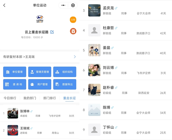 5月26日至6月26日,有研復(fù)材黨總支、工會(huì)與團(tuán)支部聯(lián)合開展“云上重走長征路,健行21天,萬步有約”活動(dòng),活動(dòng)覆蓋公司全體員工、研究生,另外 共計(jì)8個(gè)團(tuán)隊(duì)40人一起報(bào)名參與線上“云長征”。