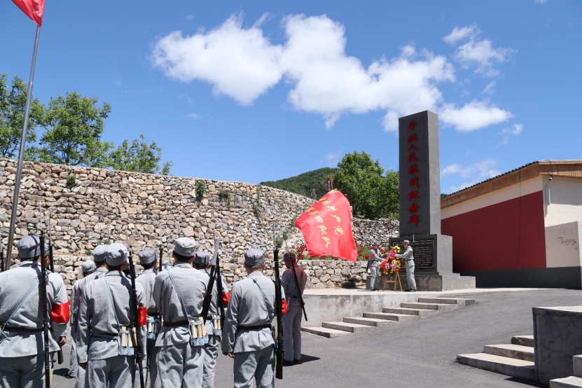 全體黨員大會結(jié)束后,有研資環(huán)院黨支部開展了紅色愛國主義主題教育活動,同志們身穿八路軍軍裝,佩戴袖標,整編隊列,井井有序,并進行授旗儀式,向平北抗戰(zhàn)紀念碑敬獻鮮花并瞻仰四位抗戰(zhàn)將領(lǐng)。