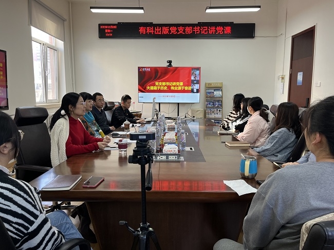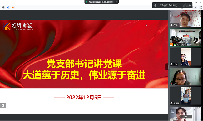 12月5日,有科出版黨支部書記錢九紅講授題為《大道蘊于歷史,偉業(yè)源于奮進(jìn)》的專題黨課。全體黨員群眾參會,會議通過線上線下同步召開。