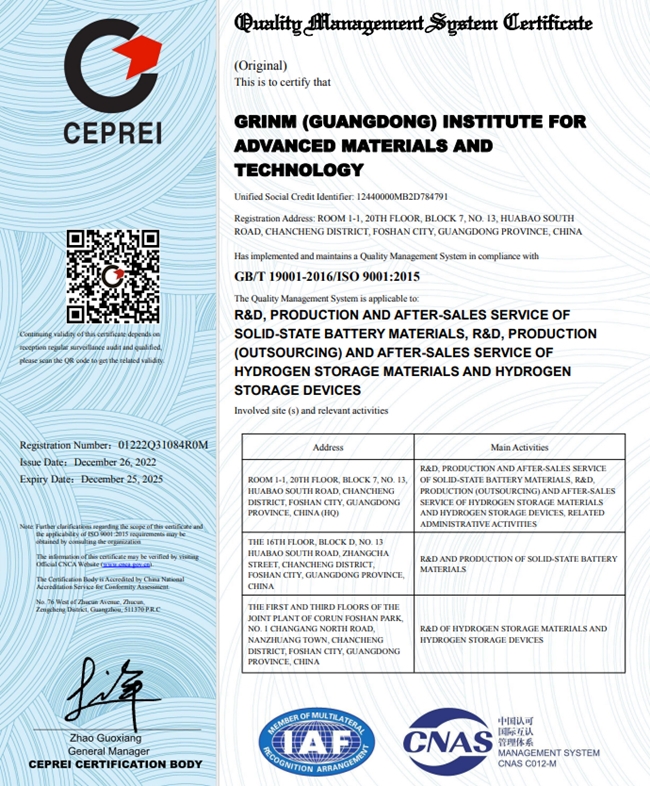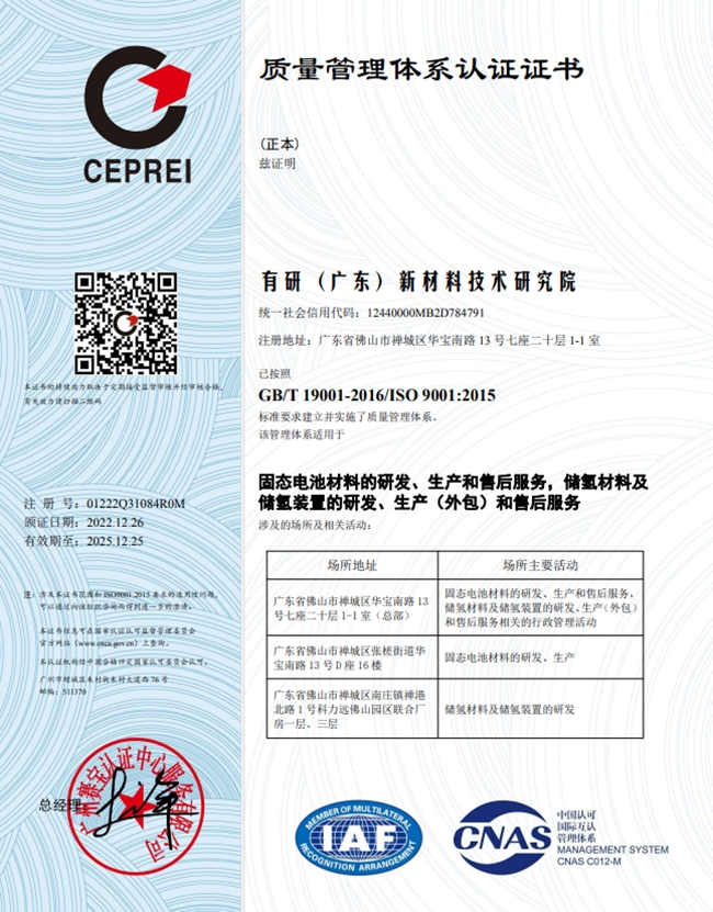 有研廣東院自2022年7月建立并實施ISO9001質(zhì)量管理體系以來,儲氫工程化團隊和固態(tài)電池團隊先后獲得ISO9001:2015質(zhì)量管理體系認證證書,為新產(chǎn)品、新技術(shù)轉(zhuǎn)化應(yīng)用提供了重要保障。