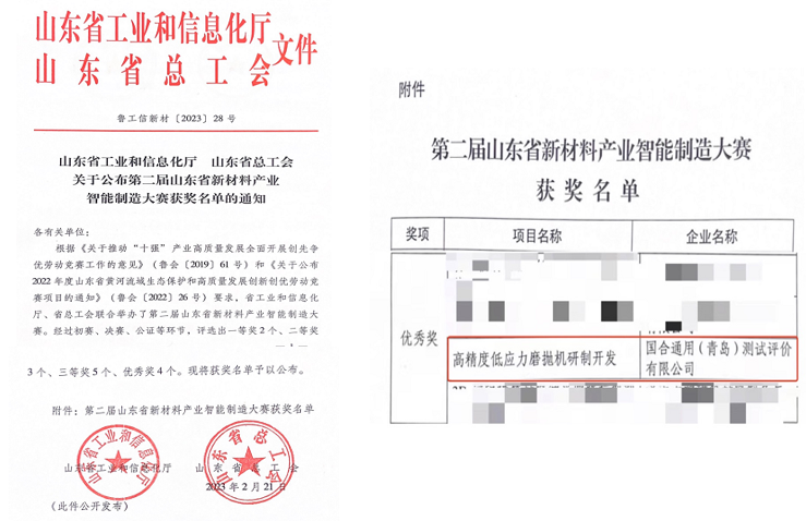 2023年2月21日,山東省工信廳和山東省總工會聯(lián)合發(fā)文公布了第二屆山東省新材料產業(yè)智能制造大賽獲獎名單,國合青島《高精度低應力磨拋機研制開發(fā)》項目榮獲優(yōu)秀獎。