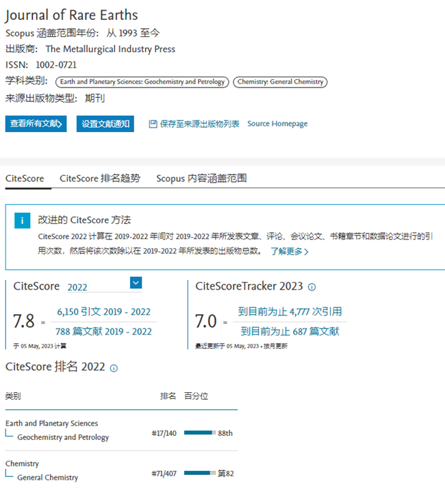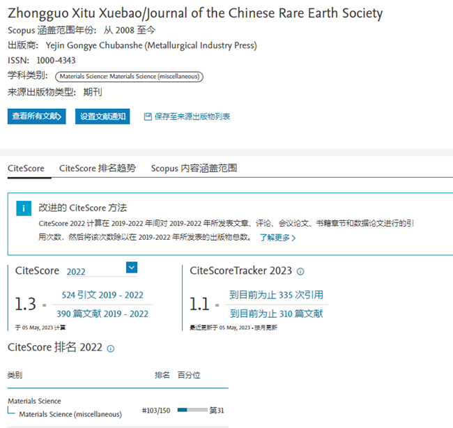 《中國(guó)稀土學(xué)報(bào)》2022年繼續(xù)保持收錄, CiteScore™為1.3,較上一年度提升18.2%,位于Q3區(qū)。