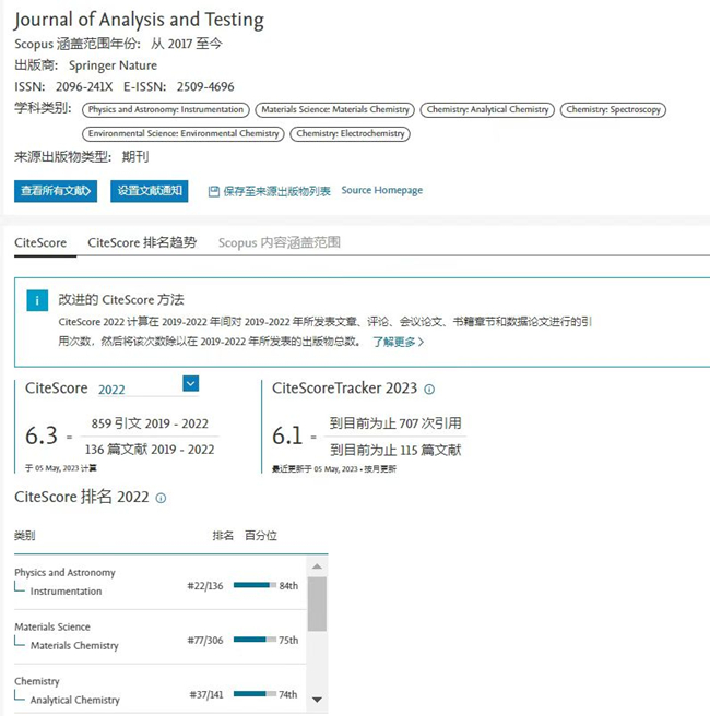 《分析檢測(cè)(英文)》2022年CiteScore™ 為6.3,較2021年度提升50%,在Instrumentation領(lǐng)域中排名22/136,提升18名,位于Q1區(qū);在Materials Chemistry領(lǐng)域中排名77/306,提升26名,位于Q1區(qū),在Analytical Chemistry領(lǐng)域中排名37/141,提升17名,位于Q2區(qū)。