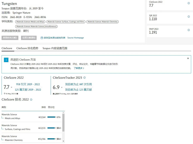 《鎢科技(英文)》在2022年首次入選CiteScore™,分?jǐn)?shù)為7.7,在Metals and Alloys領(lǐng)域排名21/164,在Surfaces,Coatings and Films領(lǐng)域排名22/131,在Materials Chemistry領(lǐng)域排名51/306,在三個(gè)領(lǐng)域均入選Q1區(qū)。