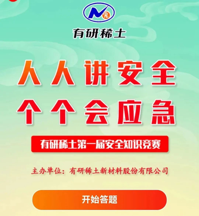 2023年6月是全國第22個“安全生產(chǎn)月”,有研稀土緊扣安全生產(chǎn)月“人人講安全,個個會應(yīng)急”的主題,于六月第一周開展了內(nèi)容豐富、形式多樣的宣傳活動,樹牢安全發(fā)展理念,強化安全生產(chǎn)意識,營造良好的安全生產(chǎn)氛圍。