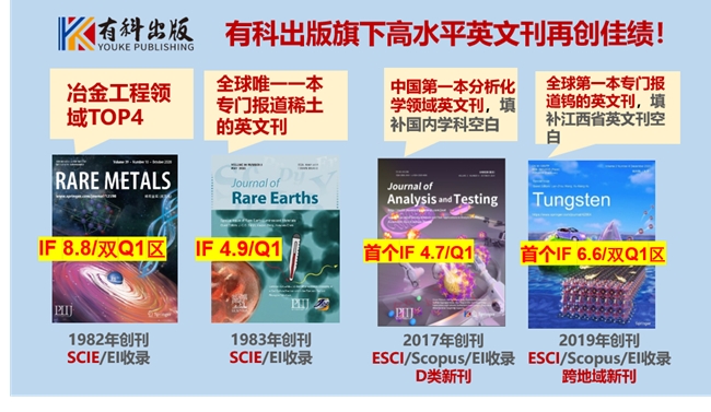 6月28日,科睿唯安發(fā)布2022年度《期刊引證報(bào)告》(Journal Citation Reports, 簡(jiǎn)稱JCR),有科出版旗下4本英文刊全球影響力繼續(xù)攀升。其中,Rare Metals以IF8.8榮登全球冶金工程領(lǐng)域第四位(4/78);Journal of Rare Earths以IF4.9穩(wěn)居全球應(yīng)用化學(xué)類期刊Q1區(qū);Journal of Analysis and Testing和Tungsten首獲影響因子,分別以IF4.7和IF6.6位于所在學(xué)科Q1區(qū)。