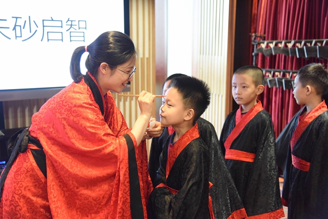 朱砂啟智又稱“開天眼”。在古代,學(xué)童入學(xué)讀書前,都會(huì)有啟蒙師長(zhǎng)用紅色的朱砂在學(xué)子們的額頭正中點(diǎn)上紅痣。寓意開啟智慧,眼明心亮,以此寄托美好的愿望。