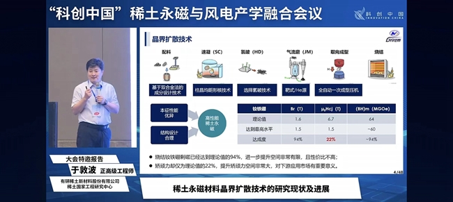 有研稀土15名科研人員做了會議報告,分享本領域的最新研究成果。其中有研新材總經理、有研稀土董事長于敦波在“科創(chuàng)中國”稀土永磁與風電產學融合會議上做了題為《稀土永磁材料晶界擴散技術的研究現(xiàn)狀及進展》的大會邀請報告,楊娟玉、劉元紅、余金秋、趙龍勝、吳道高分別做了題為《高端顯示玻璃基板用CMP鑭鈰基稀土拋光材料及其應用關鍵技術》《高品質照明與顯示用紅色熒光粉的信賴性提升研究》 《閃爍晶體用高純無水稀土鹵化物——現(xiàn)狀與展望》 《離子型稀土礦硫酸鎂選擇性強化浸取過程調控》 《高純金屬鉺的熱變形行為及組織演變》的分會場邀請報告。