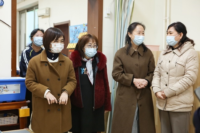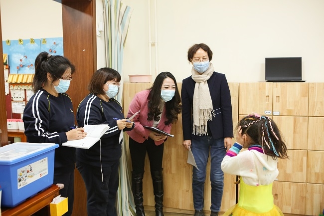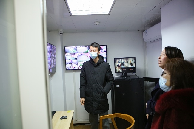 負責安全衛(wèi)生評估組專家在安全組長的陪同下,對幼兒園的監(jiān)控室、保健室等進行全面檢查。