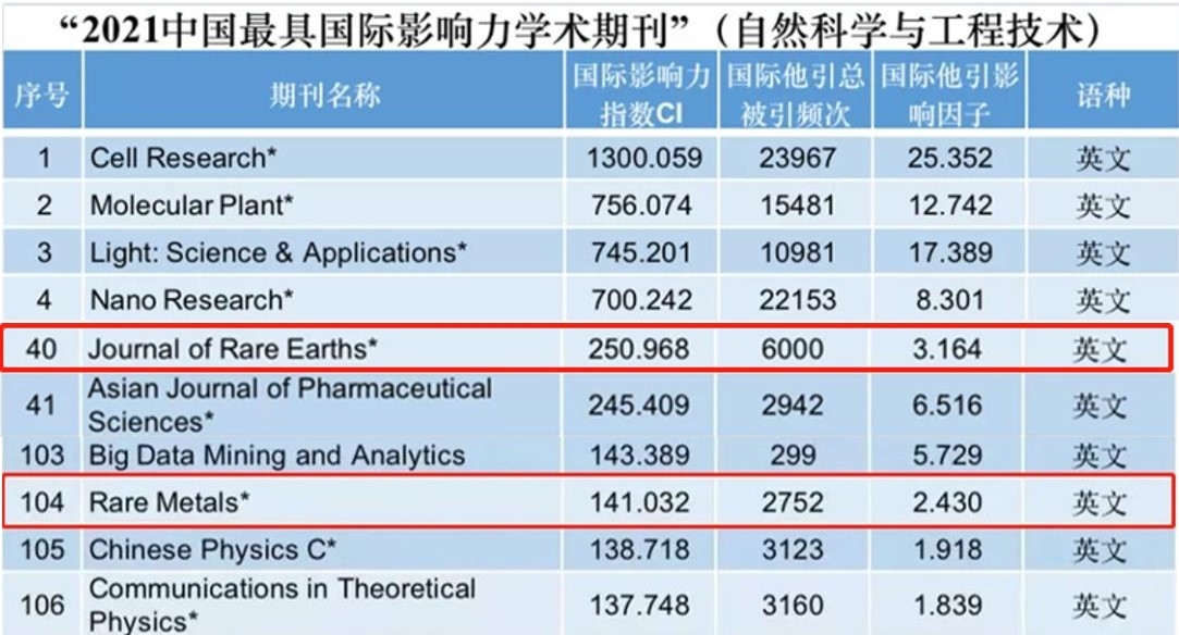 2021年12月6日,有研集團(tuán)主辦的《稀有金屬(英文版)》(Rare Metals)、《稀土學(xué)報(bào)(英文版)》(Journal of Rare Earths)雙雙入選2021年“中國(guó)最具國(guó)際影響力學(xué)術(shù)期刊”榜單,兩刊連續(xù)十年蟬聯(lián)該稱號(hào)。