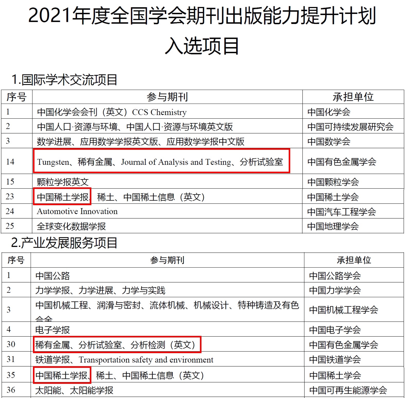 入選項目由中國有色金屬學(xué)會和中國稀土學(xué)會牽頭申報,由有科出版負責(zé)具體實施。項目旨在強化中國科協(xié)全國學(xué)會辦刊能力建設(shè),提升學(xué)會主辦科技期刊的學(xué)術(shù)組織力、人才凝聚力、創(chuàng)新引領(lǐng)力、國際影響力,全力推進一批優(yōu)秀期刊躋身世界一流陣營。