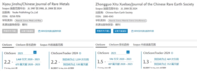 入選中文刊實現穩(wěn)步提升?!断∮薪饘佟?023年度CiteScore™為2.2,同比提升4.76%,位于Metals and Alloys領域Q2區(qū),排名80/176?!吨袊⊥翆W報》2023年度CiteScore™為1.5,同比提升15.38%,位于Materials Science領域Q3區(qū),排名127/196。