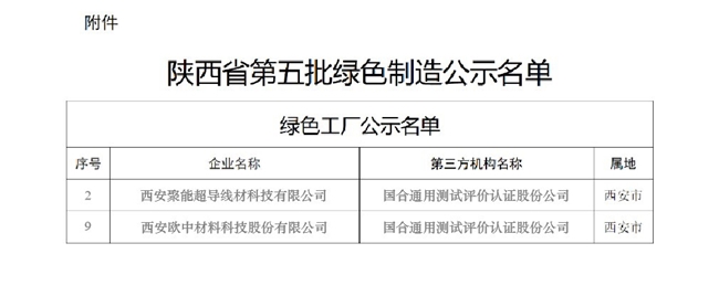 近日,陜西省工業(yè)和信息化廳公布第五批綠色制造名單,經(jīng)國(guó)合通測(cè)評(píng)價(jià)并推薦的西安聚能超導(dǎo)線材科技有限公司、西安歐中材料科技股份有限公司2家企業(yè)榮登榜單,榮獲陜西省級(jí)“綠色工廠”稱號(hào)。