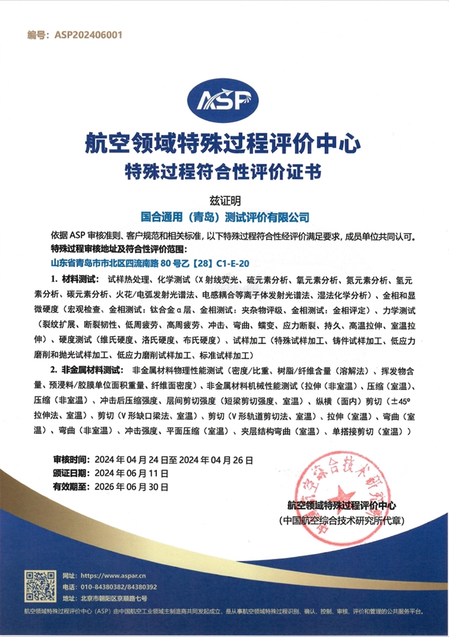 2024年6月11日,國合青島通過航空領域特殊過程評價中心評審,獲得航空領域特殊過程符合性評價認證(Aviation Special Process Review Center),成為同時擁有ASP金屬材料測試及非金屬材料測試的檢測機構。自成立以來,國合青島已相繼取得CMA、CNAS、NADCAP( MTL、NMMT)、AECC(MTL)、ASP( MTL、NMMT)等檢測資質,逐漸成為國內航空材料檢測資質覆蓋最全的機構之一。