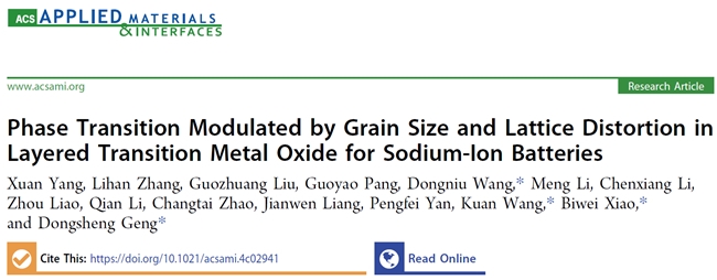 此外,團(tuán)隊(duì)針對(duì)O3型材料的相變與循環(huán)穩(wěn)定性的構(gòu)效關(guān)系,在《ACS Applied Materials & Interfaces》上發(fā)表了題為“Phase Transition Modulated by Grain Size and Lattice Distortion in Layered Transition Metal Oxide for Sodium-Ion Batteries”(影響因子9.5)的成果。該研究指出,O3型層狀正極材料脫鈉過程中產(chǎn)生的滑移是引起劇烈體積變化以及材料顆粒裂紋的主要原因,通過控制更小的晶粒尺寸及扭曲程度更大的過渡金屬-氧八面體可以有效降低滑移的剪切應(yīng)力,從而提升材料的循環(huán)壽命。