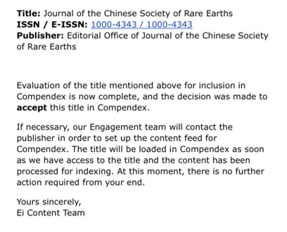 2021年4月3日,有科出版旗下《中國稀土學(xué)報》(Journal of the Chinese Society of Rare Earths)收到美國工程索引EI數(shù)據(jù)庫正式收錄通知,這是該刊繼被美國化學(xué)文摘(CA)、荷蘭Scopus、日本科技文獻速報(JST)、美國EBSCO數(shù)據(jù)庫和俄羅斯文摘(AJ)收錄后又一重要進展,標志著《中國稀土學(xué)報》國際影響力得到進一步提升?!吨袊⊥翆W(xué)報》創(chuàng)刊于1983年,是報道稀土理論研究和應(yīng)用技術(shù)的稀土類綜合性學(xué)術(shù)刊物。美國工程索引(EI Compendex, 簡稱 EI)是全球著名工程技術(shù)類綜合性檢索系統(tǒng)。它與SCI、ISTP并列成為世界公認的三大權(quán)威數(shù)據(jù)庫,最新目錄共收錄全球4500余種期刊,其中共收錄中國大陸期刊229種,中文刊157種,英文刊71種。