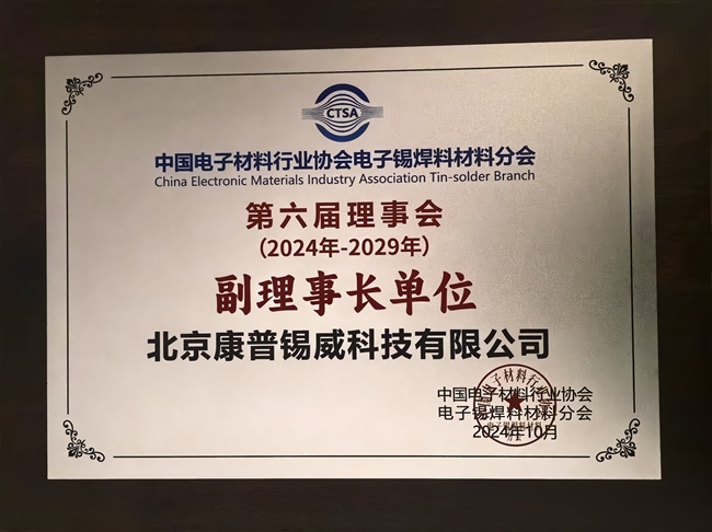 會(huì)議期間召開六屆一次會(huì)員代表大會(huì)進(jìn)行理事會(huì)換屆,康普錫威當(dāng)選為電子錫焊料材料分會(huì)的副理事長(zhǎng)單位,這是康普錫威連續(xù)第四次當(dāng)選為副理事長(zhǎng)單位,康普錫威副總經(jīng)理劉希學(xué)代表公司接受授牌。