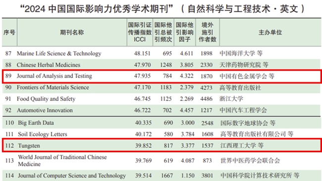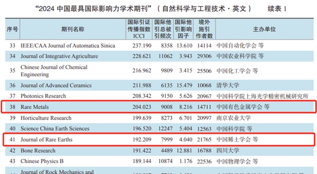 12月24日,《中國學(xué)術(shù)期刊國際引證年報(bào)(2024版)》重磅發(fā)布,有科出版旗下4本英文期刊再次入選中國國際影響力學(xué)術(shù)期刊榜單。其中,Rare Metals(《稀有金屬(英文)》)、Journal of Rare Earths(《稀土學(xué)報(bào)(英文)》連續(xù)13年入選“中國最具國際影響力學(xué)術(shù)期刊”;Journal of Analysis and Testing(《分析檢測(英文)》)、Tungsten(《鎢科技(英文)》)連續(xù)3年入選“中國國際影響力優(yōu)秀學(xué)術(shù)期刊”。