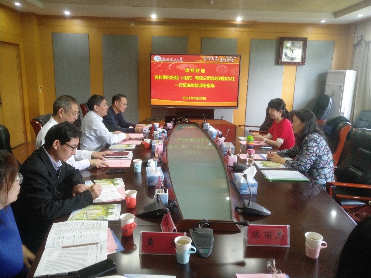 2021年4月30日,有科出版總經理錢九紅一行赴江西理工大學期刊社就有色期刊集群化建設及校企合作辦刊等事項進行深入商談與交流。江西理工大學副校長羅仙平、期刊社社長黃志紅、副社長曾偉明及期刊社各編輯部負責人出席。會議由羅仙平主持。會前,江西理工大學黨委書記、《鎢科技(英文)》主編楊斌教授會見錢九紅一行。