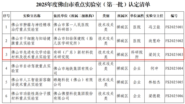 近日,佛山市科學(xué)技術(shù)局公布2025年度佛山市重點(diǎn)實(shí)驗(yàn)室(第一批)認(rèn)定清單,有研廣東院獲批佛山市先進(jìn)電化學(xué)功能材料及技術(shù)重點(diǎn)實(shí)驗(yàn)室。