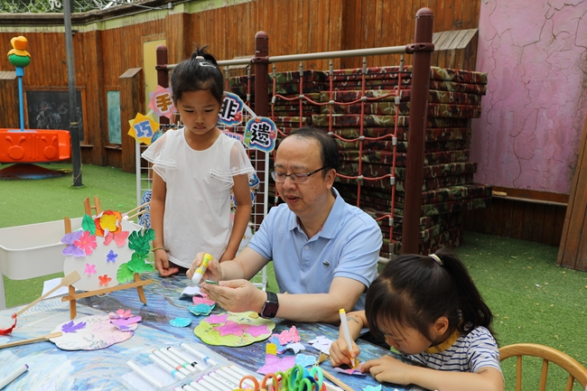 毛昌輝一行先后走進(jìn)幼兒園多功能廳、戶外活動(dòng)場地,來到孩子們身邊,觀看了“古詩吟唱”“巧手探非遺”“跳竹竿舞”“面部彩繪”等豐富多彩的迎“六一”活動(dòng),并參與了“非遺團(tuán)扇制作”,和孩子們一起歡慶節(jié)日。