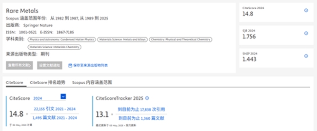 《稀有金屬(英文版)》2024年度CiteScore™為14.8,同比提升22%,繼續(xù)保持高位增長(zhǎng),在4個(gè)領(lǐng)域位于Q1區(qū),排名全部位于所屬領(lǐng)域前10%,其中在Metals and Alloys領(lǐng)域排名10/175(前10%);在Physical and Theoretical Chemistry領(lǐng)域排名15/187(前10%);在Condensed Matter Physics領(lǐng)域排名21/443(前5%);在Materials Chemistry領(lǐng)域排名26/324(前10%)。