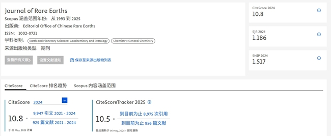 《稀土學(xué)報(bào)(英文)》2024年度CiteScore™為10.8,同比提升24%,雙Q1區(qū),其中在Geochemistry and Petrology領(lǐng)域排名6/163(前5%);在General Chemistry領(lǐng)域排名52/404(前15%)。