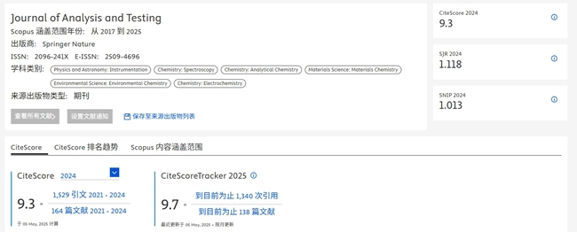 《分析檢測(cè)(英文)》2024年度CiteScore™為9.3,同比提升26%,在6個(gè)領(lǐng)域位于Q1區(qū),其中在Analytical Chemistry領(lǐng)域排名26/160(前20%);在Instrumentation領(lǐng)域排名17/174(前10%);在Spectroscopy領(lǐng)域排名11/79(前15%);在Material Chemistry領(lǐng)域排名55/324(前20%);在Environmental Chemistry領(lǐng)域排名34/150(前25%);在Electrochemistry領(lǐng)域排名16/64(前25%)。