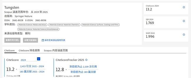 《鎢科技(英文)》2024年度CiteScore™為13.2,同比提升50%,在4個(gè)領(lǐng)域位于Q1區(qū),其中在Metals and Alloys領(lǐng)域排名13/175(前10%);在Materials Chemistry領(lǐng)域排名30/324(前10%);在Surfaces,Coatings and Films領(lǐng)域排名14/132(前15%);在Materials Science(miscellaneous)領(lǐng)域排名25/232(前15%)。