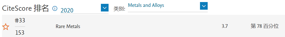 《稀有金屬》 CiteScore 2020:1.3,較2019年度(1.0)提升30%,位于Metals and Alloys學(xué)科Q3區(qū)(90/153),較2019年度(93/152)提升3名。