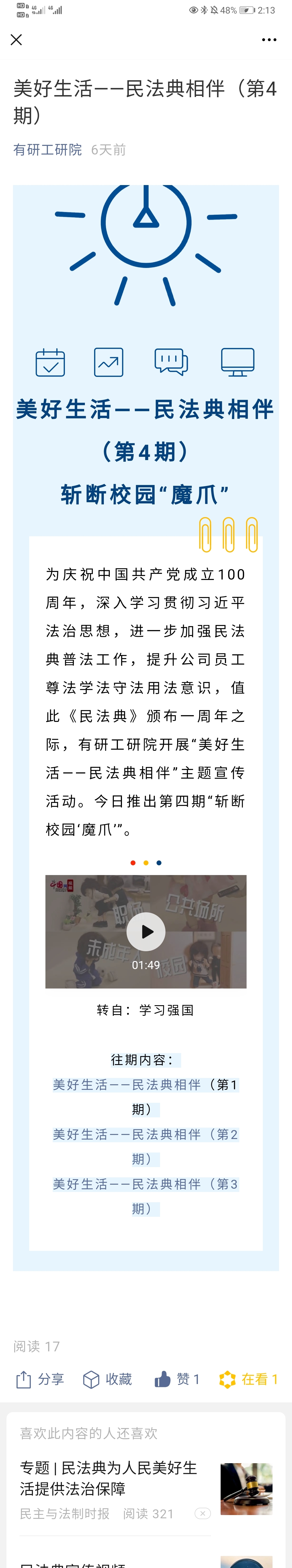 公司官方微信公眾號(hào)連續(xù)4天進(jìn)行普法專題宣傳,組織觀看《中華人民共和國(guó)民法典》宣傳小視頻,將法治性、思想性同藝術(shù)性、觀賞性有機(jī)融合,增強(qiáng)了宣傳活動(dòng)的效果。此外,產(chǎn)業(yè)技術(shù)部通過(guò)發(fā)放《中華人民共和國(guó)民法典》組織自學(xué),在全公司營(yíng)造濃厚的《中華人民共和國(guó)民法典》宣傳學(xué)習(xí)氛圍。