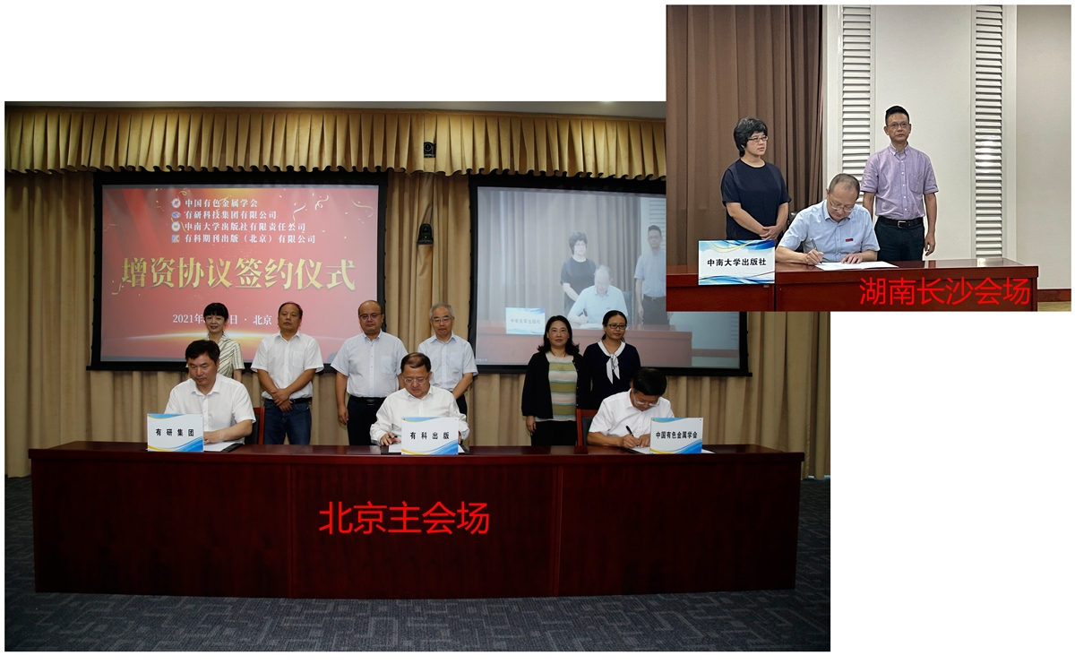 2021年8月26日,有研集團(tuán)所屬有科出版增資協(xié)議簽約儀式在北京、湖南長(zhǎng)沙同步舉行,中南大學(xué)出版社以有色行業(yè)唯一期刊數(shù)據(jù)庫(kù)“中國(guó)有色金屬知識(shí)庫(kù)”所有權(quán)作價(jià)入股有科出版。