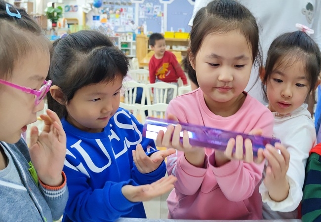 黃院士向孩子們講述了科學家們不畏艱難、拼搏創(chuàng)新、忘我工作的精神,介紹了有研集團稀土領域的院士以及國內外的大科學家。孩子們高聲說到:“長大了,我也要當科學家!”。黃院士帶來了“懷舊煤油燈”、強力稀土磁鐵等材料,與孩子們共同體驗了半導體芯片手電的奇妙?;顒雍?,孩子們向黃院士介紹了班級主題活動“宇航員叔叔回來了”,黃院士與孩子們親切互動。