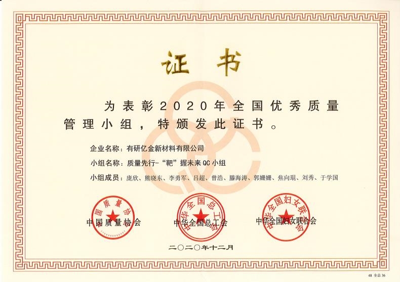 近日,從中國質量協(xié)會年會上傳來喜訊,有研集團三級子公司有研億金質量先行—“靶”握未來QC(質量控制)小組被中國質量協(xié)會、中華全國總工會、中華全國婦女聯(lián)合會聯(lián)合授予“2020年全國優(yōu)秀質量管理小組”稱號。