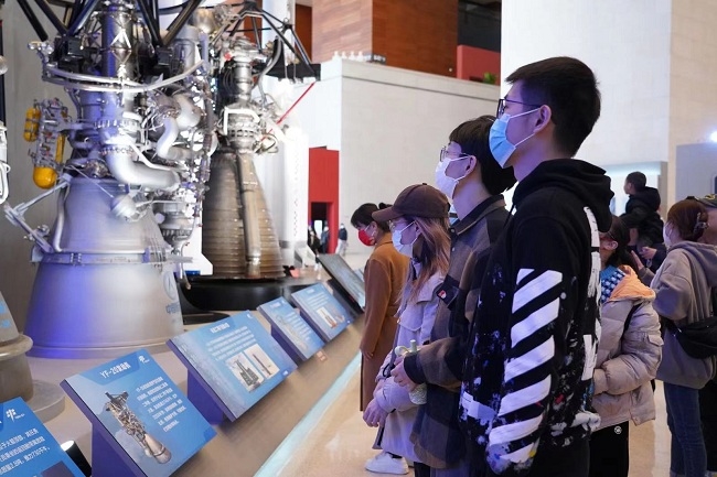 進入展廳,同學們仔細觀察展品模型,大到火箭、發(fā)動機、空間站,小到航天食品、航天服等都能成功喚起大家的好奇心。一些研究生黨員作為航天愛好者主動做起了講解,分享航天工程與航天材料有關知識。大家時而專注交流,時而凝神觀看,全身心地沉浸在豐富詳實的展覽內(nèi)容之中。