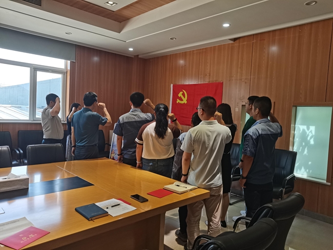 黨支部書(shū)記廖贊組織新發(fā)展黨員進(jìn)行入黨宣誓,老黨員重溫入黨誓詞。面對(duì)鮮紅的黨旗,廖贊作為領(lǐng)誓人,帶領(lǐng)支部新老黨員一起高舉右手,莊嚴(yán)宣誓。“我志愿加入中國(guó)共產(chǎn)黨……”鏗鏘恢宏的誓詞,強(qiáng)烈震撼著在場(chǎng)的每一位黨員,一字一句,神圣而豪邁,體現(xiàn)了對(duì)中國(guó)共產(chǎn)黨的無(wú)限忠誠(chéng)。