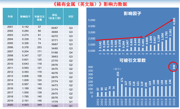 博觀約取,厚積薄發(fā)。2001年,期刊被美國《科學(xué)引文索引》SCIE收錄,其后期刊影響因子和影響力穩(wěn)步提高,特別是近十年,影響因子呈飛躍式攀升:從0.493穩(wěn)步提升至4.003,增長8倍,發(fā)文量從119篇增加到349篇;2019年首次進入國際冶金工程類Q1區(qū),成為中國81本Q1區(qū)期刊之一;2020年度影響因子在中國大陸265本SCI收錄期刊中排第96位、冶金工程領(lǐng)域中國大陸11種期刊中排第3位;2020年度發(fā)文量在中國大陸265本SCI收錄期刊中排第16位、冶金工程領(lǐng)域中國大陸11種期刊中排第3位。期刊影響因子和發(fā)文量實現(xiàn)雙增長,是一流科技期刊一流學(xué)術(shù)平臺初期探索與實踐的成功案例。此外,《稀有金屬(英文版)》獲得多項行業(yè)獎項,入選中國科技期刊卓越行動計劃,獲評國家新聞出版局首屆全國百強報刊、中國科協(xié)優(yōu)秀國際科技期刊獎、中國最具國際影響力學(xué)術(shù)期刊(連續(xù)9年)、“有色金屬領(lǐng)域科技期刊高質(zhì)量分級目錄”T1級別期刊、中國有色金屬出版物獎(連續(xù)4次)、中國科協(xié)主管科技期刊審讀優(yōu)級期刊等。