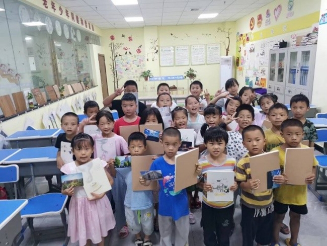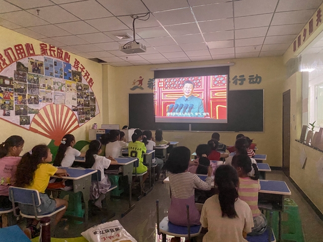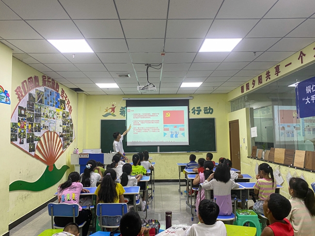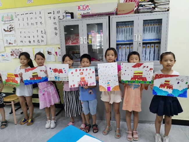 2021年,在建黨一百周年之際,研究生支教團的志愿者們緊隨學黨史的熱潮,圍繞“學黨史、感黨恩、跟黨走”這一主題,給社區(qū)的孩子們開展了黨史學習教育,包括專題思政課、慶祝建黨一百周年繪畫課、《我和我的祖國》觀影活動。思政課上研究生支教團與同學們一同回顧了慶祝中國共產黨成立100周年大會,認真學習了習近平總書記重要講話、共青團員與少先隊員代表致辭,習近平總書記的講話讓大家感受到由衷的自豪感,也讓孩子們暗暗許下了“請黨放心,強國有我”的誓言。隨后進行了先進人物事跡的講述,讓孩子們感受共產黨員全心全意為人民服務的高貴品格,引導他們從小樹立報效祖國服務社會的崇高理想信念。最后帶領他們學習黨旗、黨徽、國旗的組成元素與含義,了解五四青年節(jié)、七一建黨節(jié)、國慶節(jié)等,進一步傳承和弘揚中國共產黨優(yōu)秀的紅色文化,讓孩子們感受黨的光榮傳統中蘊含的智慧與精神。