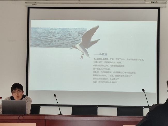 檢測事業(yè)部張世東分享了《老人與?!罚爬撕C魍P下捕魚者與海洋生物搏斗的驚險歷程,通過重要片段介紹了捕魚者身上的精神特質(zhì)與品格。盡管海明威筆下的老人是悲劇性的,但他身上卻有著尼采“超人”的品質(zhì),泰然自若地接受失敗,沉著勇敢地面對死亡,這些“硬漢子” 體現(xiàn)了海明威的人生哲學(xué)和道德理想,即人類不向命運(yùn)低頭,永不服輸?shù)亩肥烤窈头e極向上的樂觀人生態(tài)度。