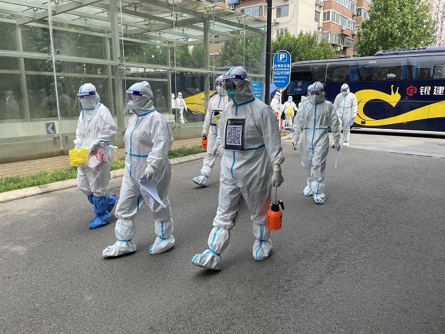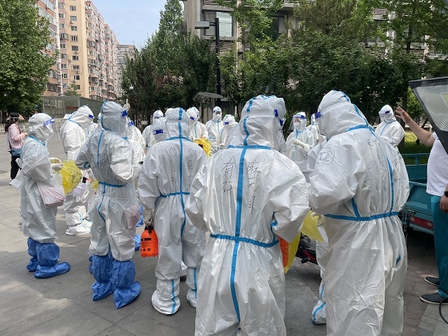 上午8點(diǎn)許,志愿者們集合完畢。按照社區(qū)工作安排,入戶采樣工作陸續(xù)開始。志愿者們配合核酸檢測(cè)醫(yī)務(wù)人員,挨家挨戶敲門通知、收還身份證、細(xì)心進(jìn)行身份登記,每棟樓、每個(gè)單元、每一樓層、每個(gè)人,確保無一遺漏。當(dāng)天北京的最高氣溫到達(dá)32℃,志愿者和醫(yī)務(wù)人員們身著密不透風(fēng)的防護(hù)服,任憑衣物被汗水浸透、面罩被水汽模糊,卻始終堅(jiān)守在志愿崗位上,盡職盡責(zé)地完成自己的工作使命。許多志愿者們顧不上吃早飯,一直堅(jiān)持空腹工作到下午3點(diǎn)。