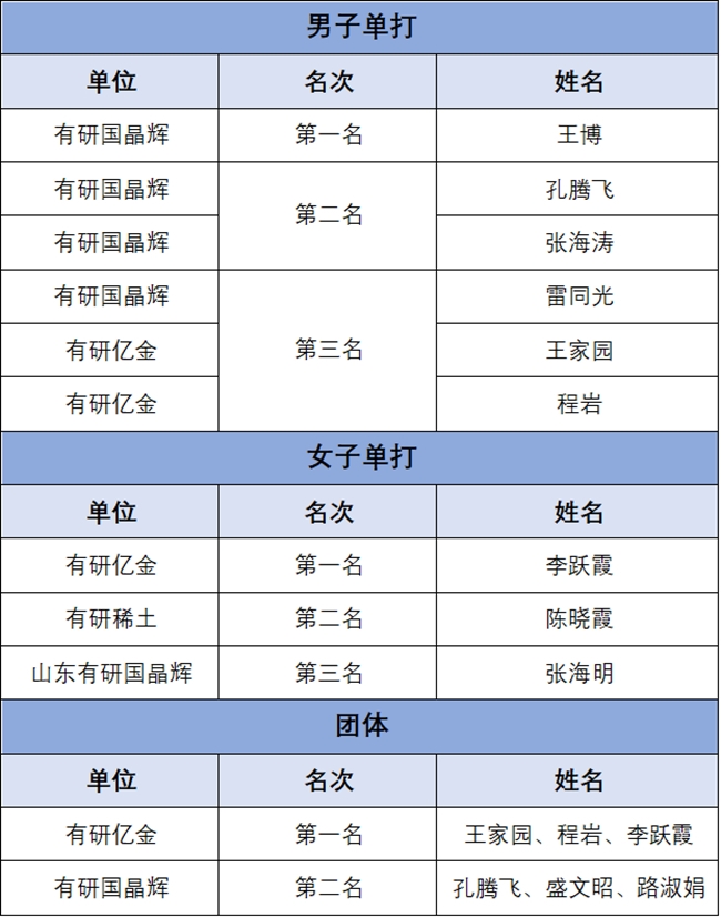 經(jīng)過激烈的比賽,各項(xiàng)冠軍紛紛出爐。有研億金憑借出色的團(tuán)隊(duì)協(xié)作和實(shí)力奪得了團(tuán)體賽桂冠,有研國(guó)晶輝王博和有研億金李躍霞分別獲得男子單打和女子單打冠軍。